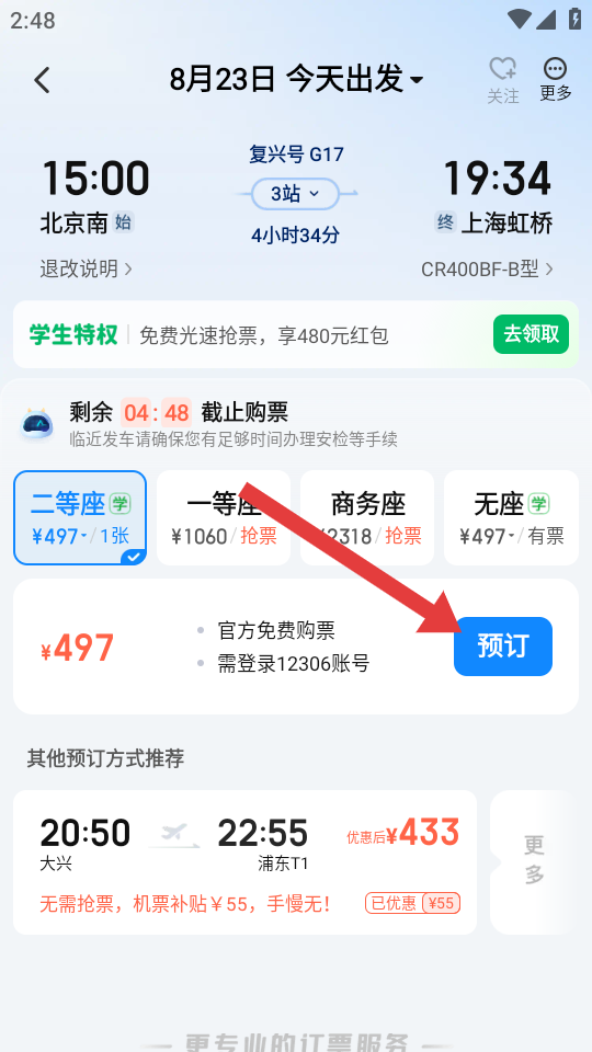3、进入所选车次详情页后,确认座位的类型,点击预订按钮,按提示登录12306账号并完成购票流程。