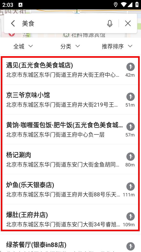 3、点击分类后,界面会列出周边该分类下的相关地点信息,包括名称、地址和距离。