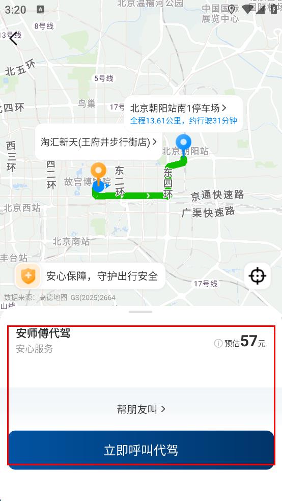 3、路线规划完成后,查看代驾预估费用等信息,确认无误后,点击页面底部“立即呼叫代驾”按钮,等待代驾司机接单并前来提供服务。