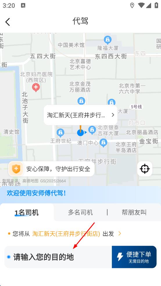 1、打开代驾服务软件,进入主界面后,点击“代驾”选项,进入代驾服务页面,在页面中找到“请输入您的目的地”输入框。