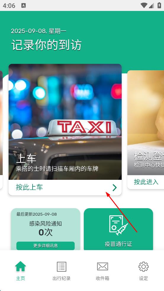 2、在主界面,找到“记录你的到访”板块中的“上车”选项,点击“按此上车”,进入的士车牌相关页面。