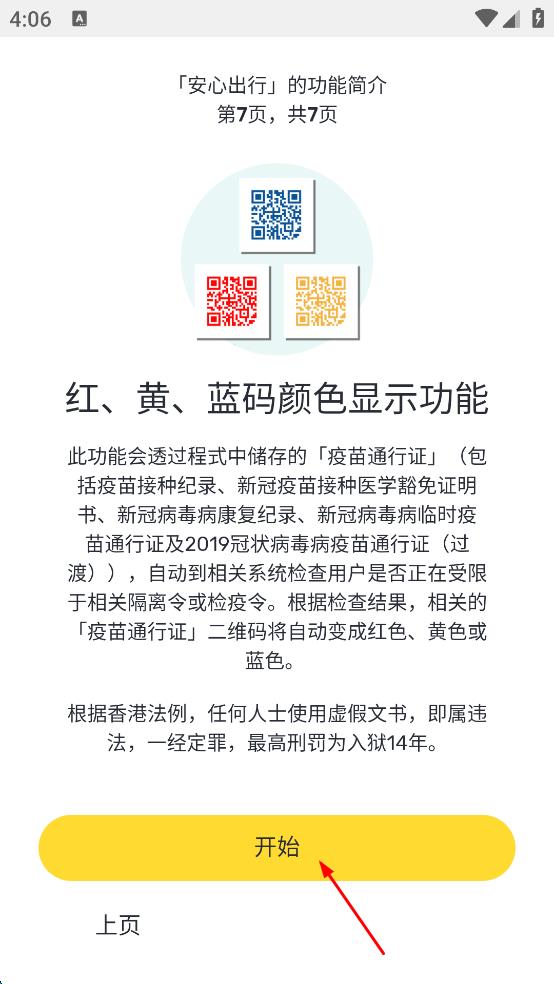 1、打开安心出行APP,在功能简介最后一页,点击“开始”按钮,进入APP主界面,准备进行到访记录操作。