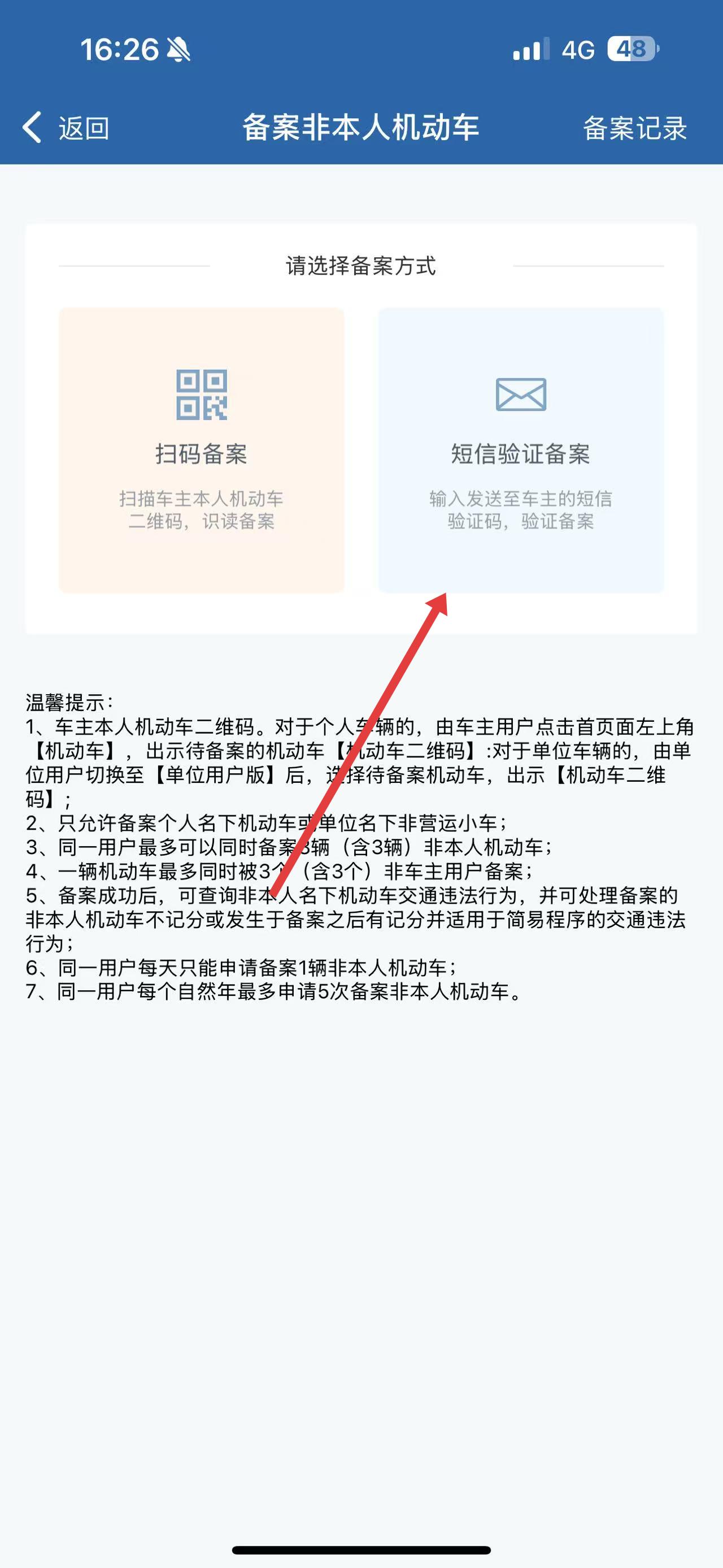 2、在备案方式选择界面,点击短信验证备案,选择通过短信验证码来进行备案操作。