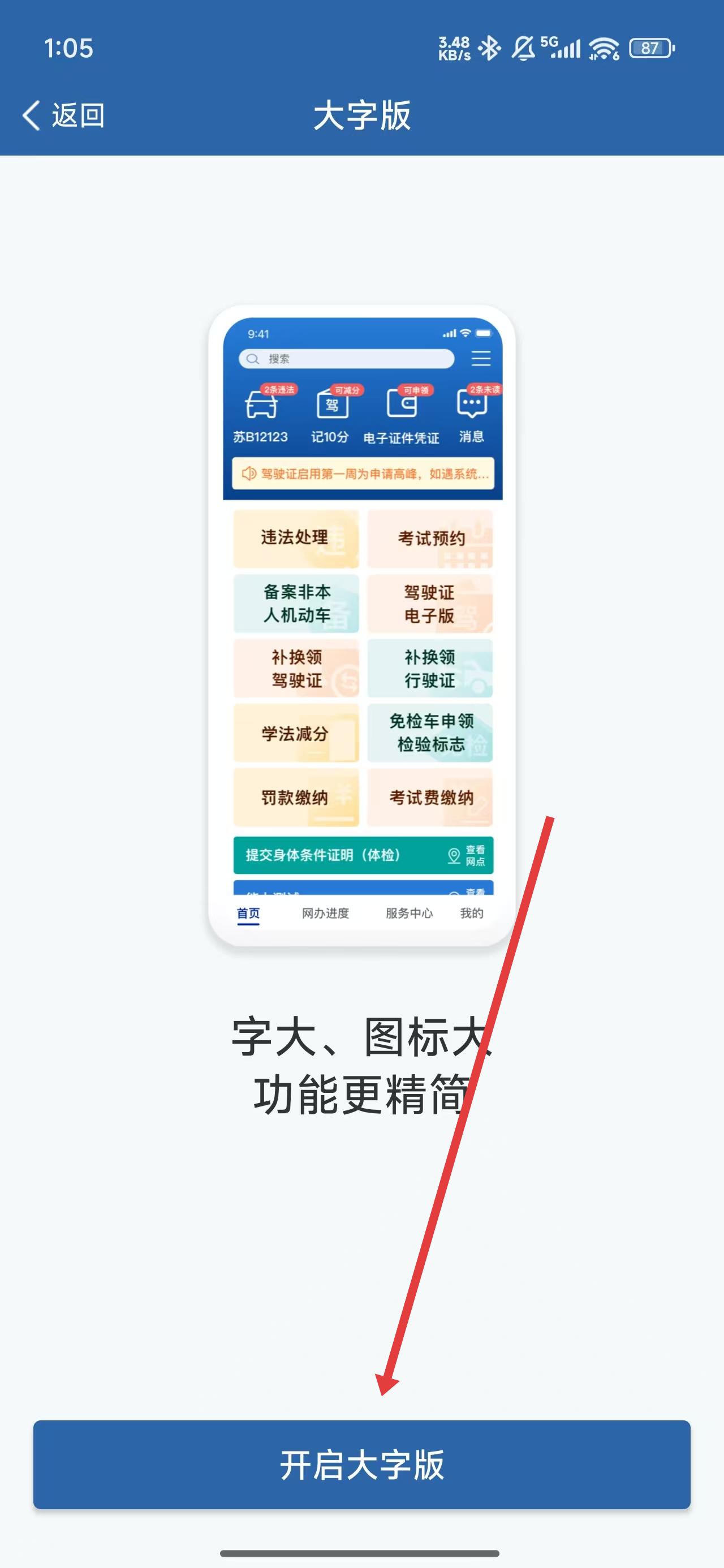 4、在进入到大字版页面中后,可以点击开启大字版按钮开启该功能。