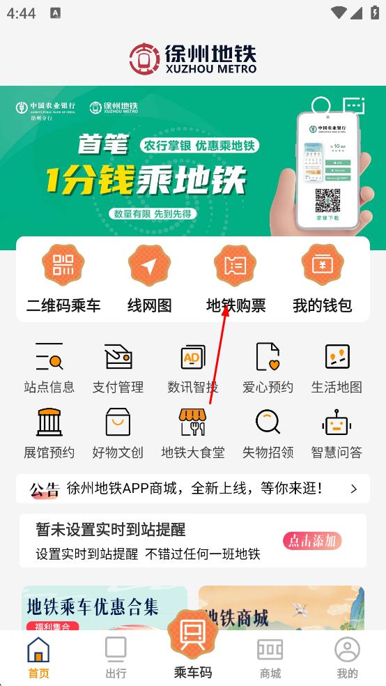 1、打开徐州地铁APP,在首页点击“地铁购票”选项,进入站点列表页面,可按线路查看站点或搜索站点名。