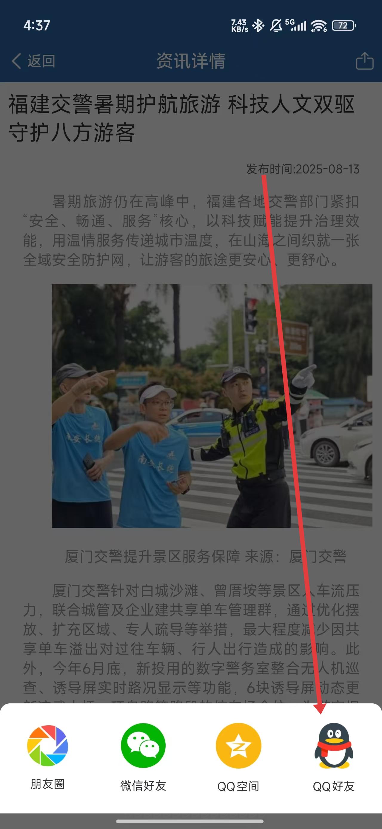 4、可以通过点击QQ图标,上传给QQ好友查看这条最新资讯。