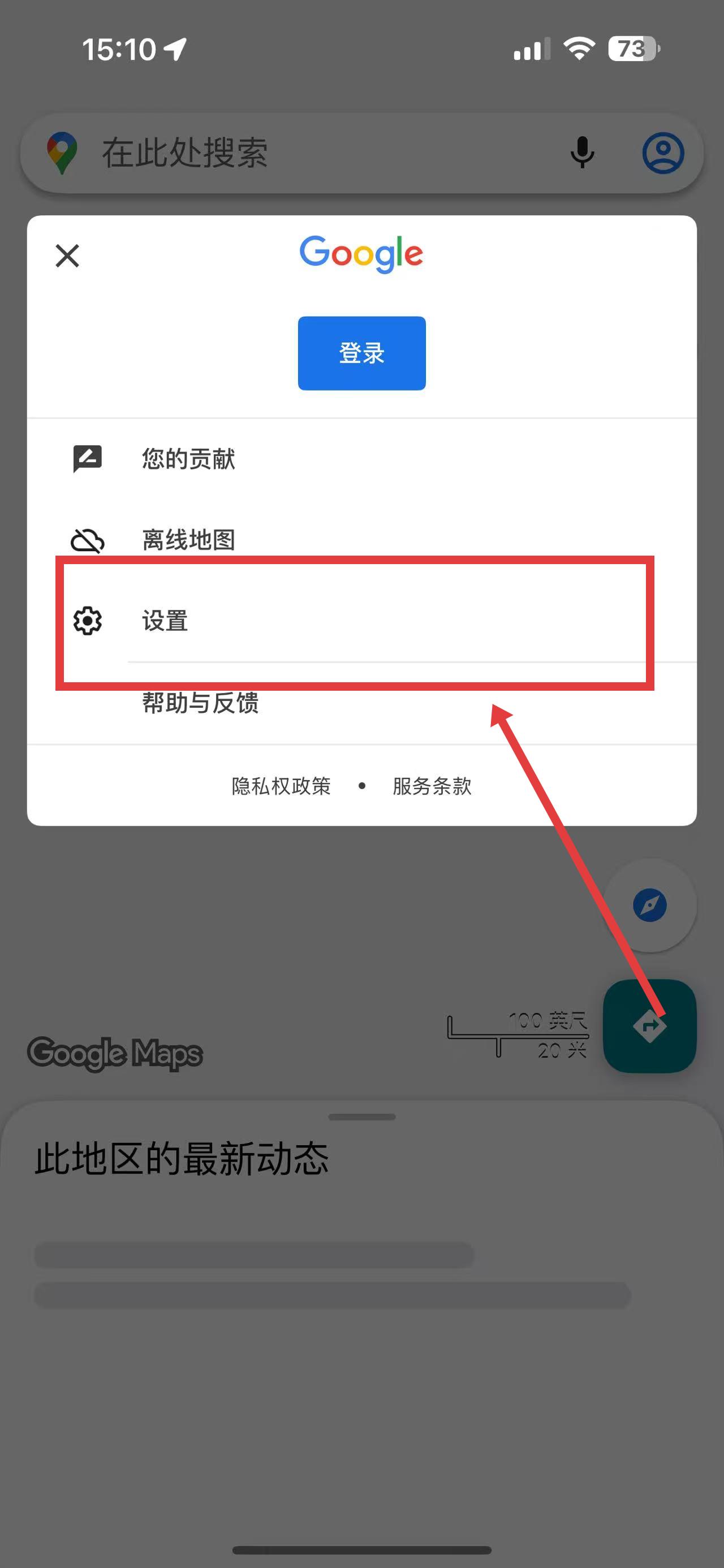 1、打开谷歌地图应用,点击左上角区域唤出菜单,然后点击设置选项进入设置页面。