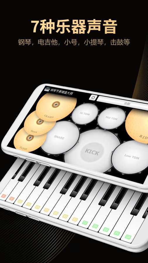 - 高品质多音色:原声钢琴,电钢琴,原声吉他,电吉他,小号,小提琴和架子鼓