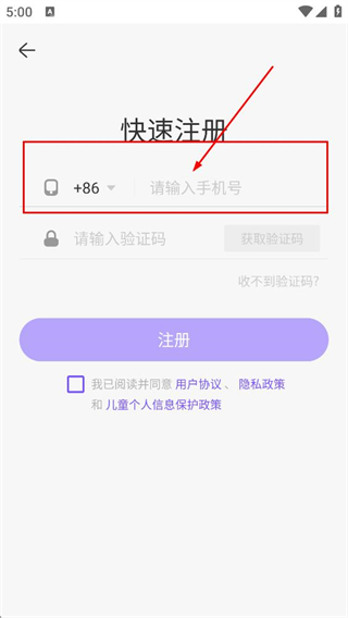 1、在手机验证码登录页面,点击右上角的注册选项,进入快速注册页面。