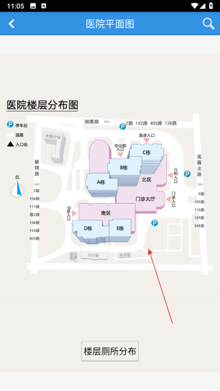3、进入楼层导航的医院平面图,依据楼层分布图,识别各楼栋及门诊大厅急诊等区域位置,点击楼层厕所分布,查询卫生间位置,便捷就医。