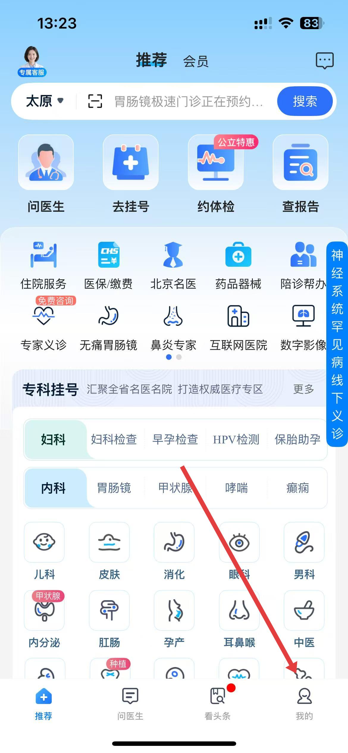 1、打开健康山西app,点击底部导航栏最右侧我的选项,进入个人相关页面。