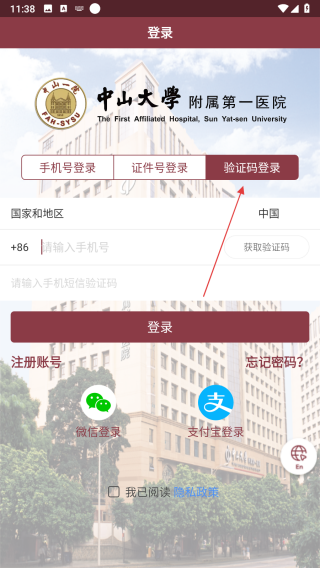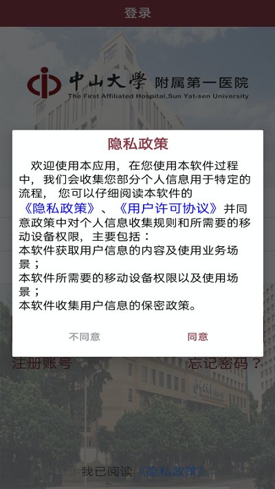 用户注册成功后,请输入“登录名(手机号码)“和”密码“登录进入中山大学附属第一医院APP软件。如下图: