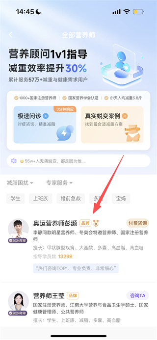2、在营养师页面,选择目标营养师,进入其个人详情页。