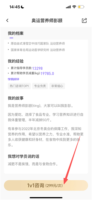 3、在详情页,点击1v1咨询按钮,即可咨询该营养师。