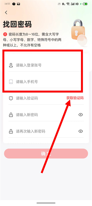 2、在找回密码页面,输入登录账号、手机号,点击获取验证码。