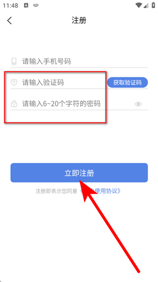 4、将收到的验证码填入对应框,设置密码后,点击立即注册,完成操作。