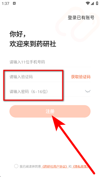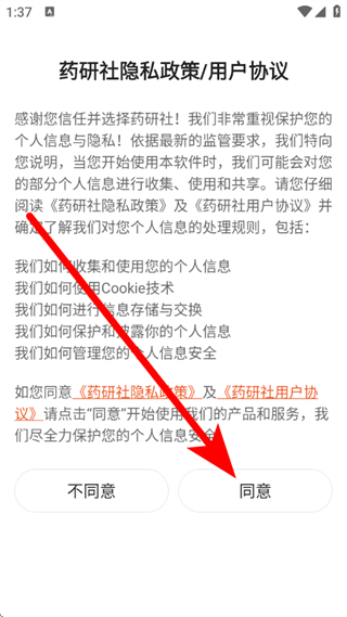 1、打开药研社,在弹出提示框,点击同意,进入欢迎页面。
