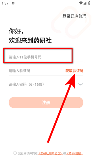 3、在注册页面,输入手机号码,点击获取验证码。