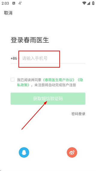 3、在登录页面填写手机号,勾选协议后,点击获短信取验证码。