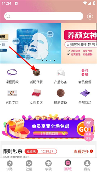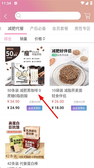 2、在商城页面,点击减肥代餐分类,进入对应商品列表页面。