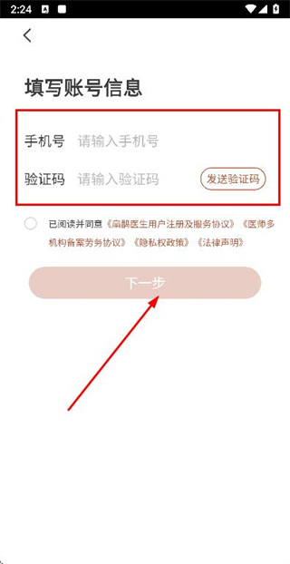 3、在注册账号页面填写手机号和验证码,勾选协议后点击下一步完成账号注册操作。