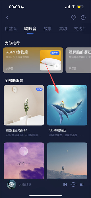 3、在助眠音页面,选择目标内容,进入该内容详情页。