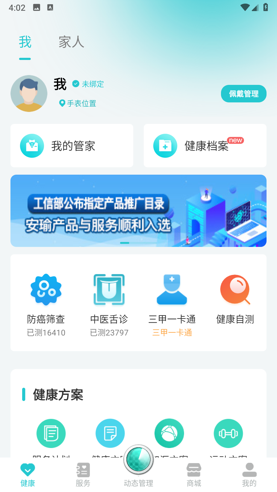 1、打开健管助手APP,点击底部菜单栏中的健康选项,进入健康相关页面。