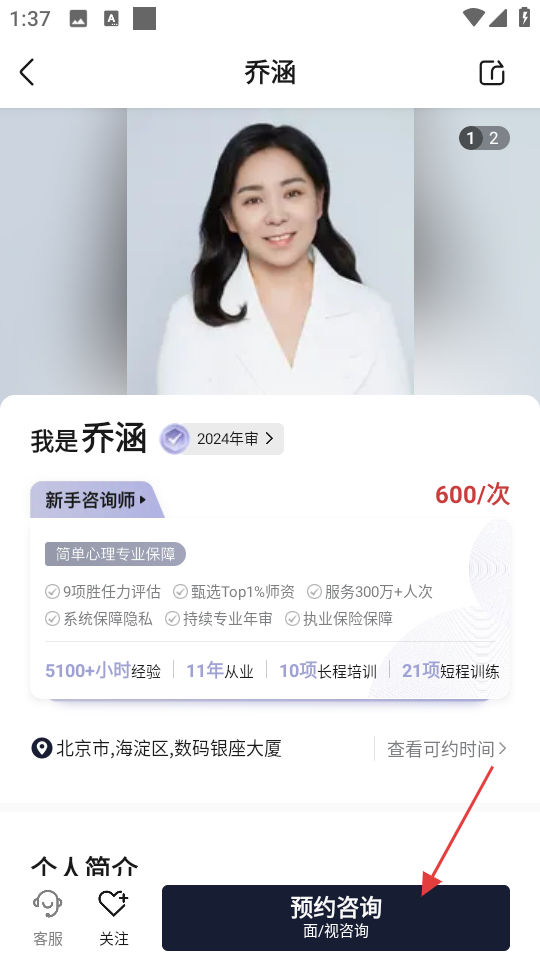 3、进入乔涵的个人页面后,点击预约咨询按钮。