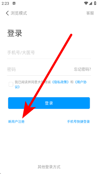 2、在登录界面,点击新用户注册,进入注册页面。