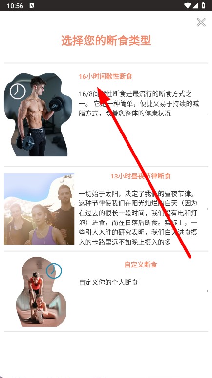 3、进入选择断食类型页面后,选择16小时间歇性断食。