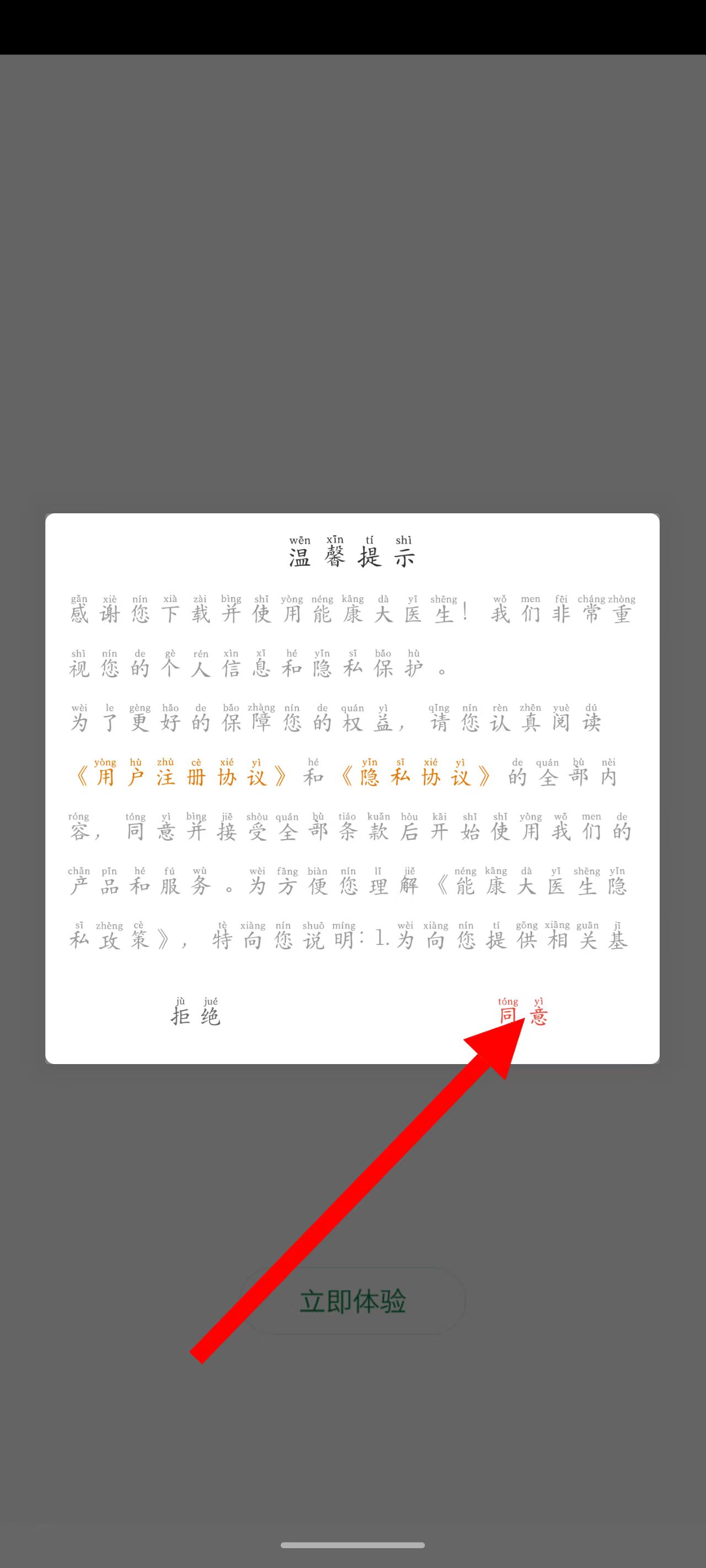 1、打开APP,在温馨提示弹窗中点击同意。