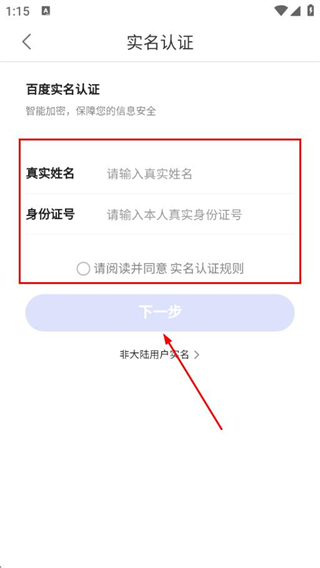 3、输入真实姓名和身份证号,勾选同意实名认证规则,点击下一步,完成后续认证步骤即可。