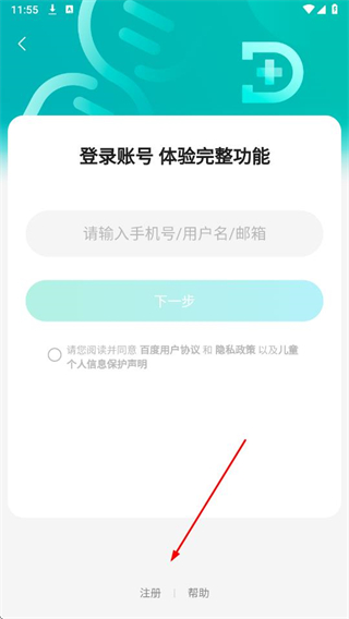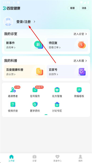 1、打开百度健康医生版APP,点击登录/注册。