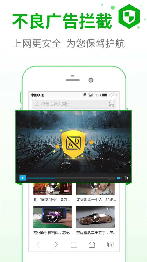 安全浏览器是一款针对安卓用户精心研发的无不良广告安全极速上网浏览器。 【产品特点】 1.自动屏蔽所有不良广告 2.内核极简,极速启动,占用手机资源极少超省电 我们还为您精选了适合安卓手机浏览的中文网站,让您随时随地关注包括新闻、小说、视频、购物、微博、娱乐、财经、社区、交友、团购、汽车等各类内容 .赶快下载安装吧~