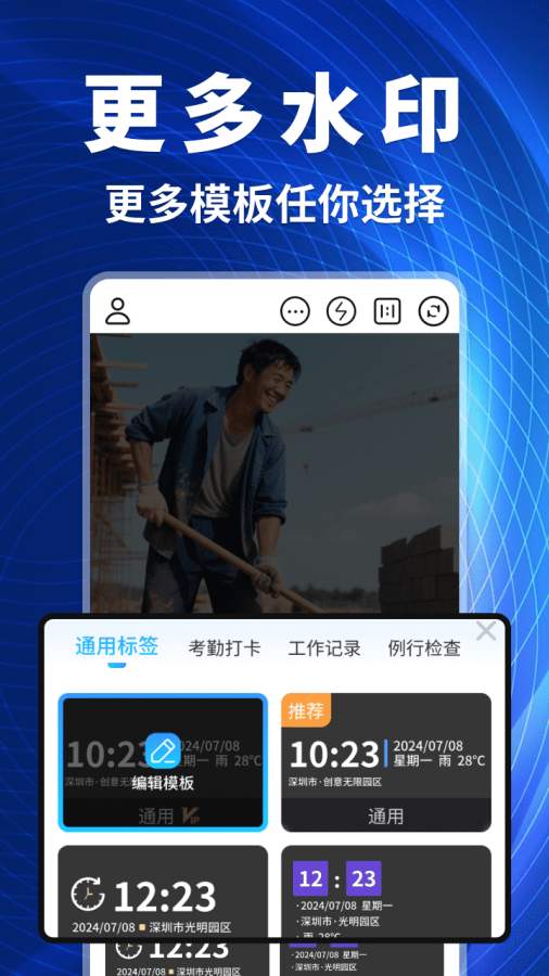 【水印拍照】拍出来的照片带上水印【更多模板】选择多种水印【拼图汇报】固定好的布局,只需更换内容【连拍汇报】连拍图片,按照顺序拼图汇报 来自应用汇: 极客水印相机