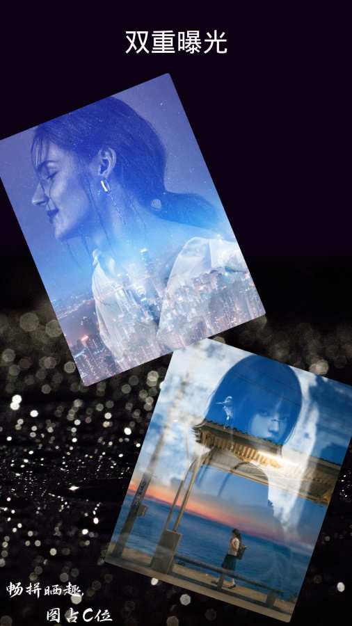 • 双重曝光:一键完成照片与我们精心挑选的图片或另一张照片的艺术感调配混合,轻松制作艺术感十足的梦幻影像。
