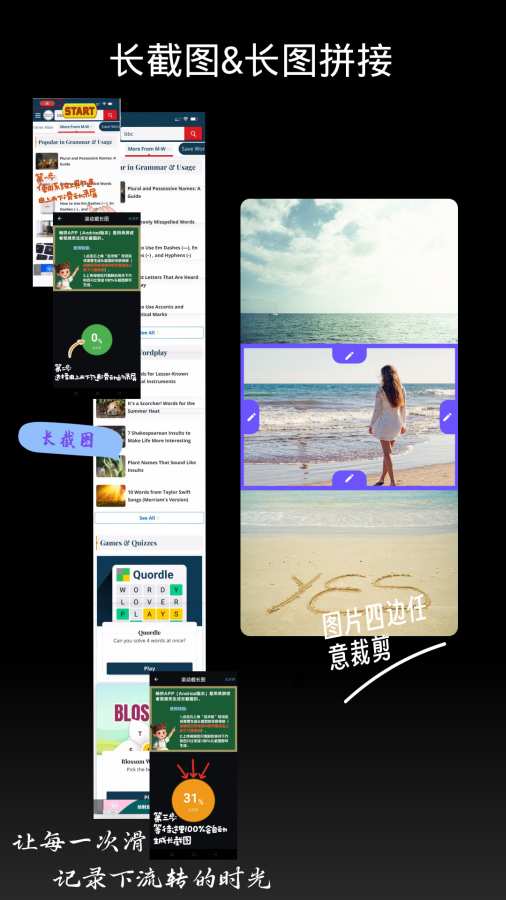 • 长图拼接:支持多张图片横向或纵向拼接,自由裁剪四边,灵活顺序调整,拼长图,台词、多图拼接更随心所欲。