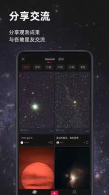 -在广场分享你的作品:与来自全球的天文爱好者交流心得,展示你的观测成果。