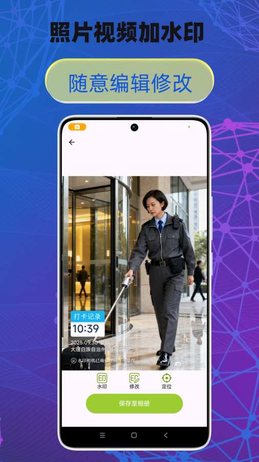 - 水印全能覆盖:支持照片、视频双格式加水印,时间、地点、经纬度、天气等信息一键添加,精准记录每一个关键瞬间,可用于考勤打卡、工程巡检等场景,确保内容真实可信。