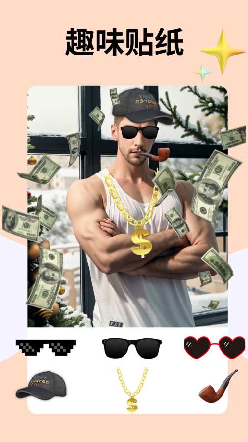 拥有熊猫头、墨镜、香烟、马桶人、龙图、火影、王者等海量热门流行贴纸进行贴图,还支持红眼、激光、特效等GIF动态贴图,使表情包效果更加炫酷。