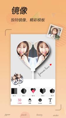 支持海量镜像效果:可以为您的美图添加文本、镜像、3d形状效果、贴纸、滤镜等功能一应俱全,方便您组合生成不同的照片;海量贴纸,记录您的美好时刻美好心情