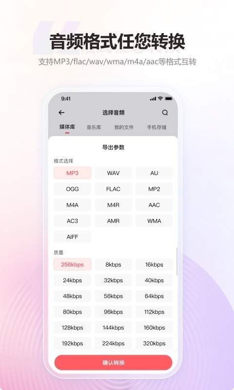 【格式转换】支持多种音频格式转换,包括mp3/aac/m4a/wma/wav/flac等。