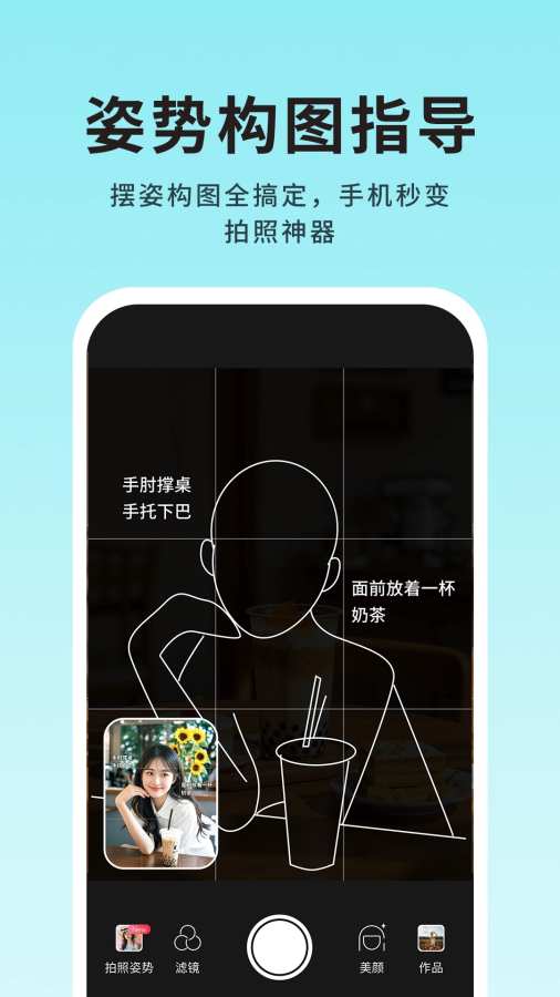包含拍照构图和摆姿模板包括:情侣合拍、自拍、形象照、旅拍、个人写真、闺蜜照、儿童摄影等数百套姿势构图样板。并提供手机拍照网格线和引导线。