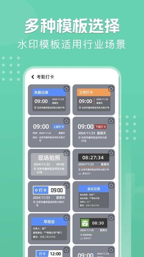 超多种水印模板,支持各种生活和工作打卡需求,现场拍照打卡,日常考勤打卡,记录工作轨迹,记录时间和地点。