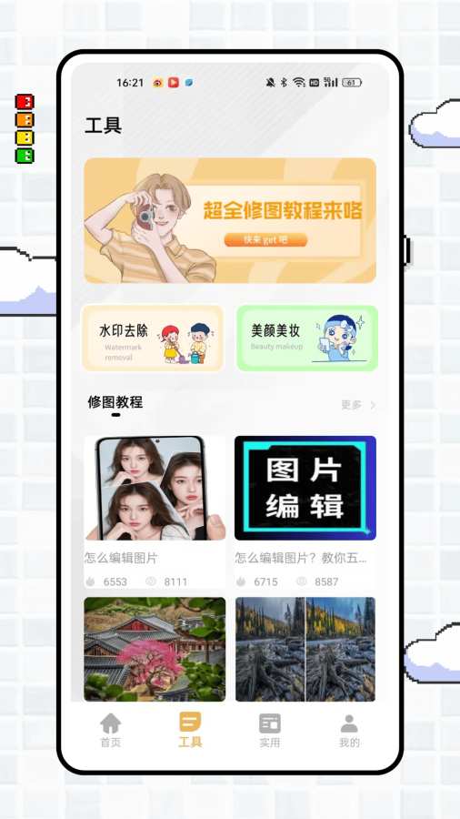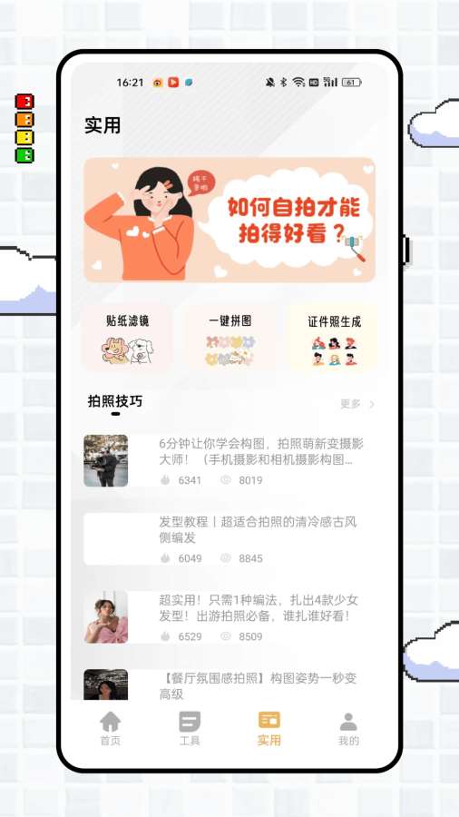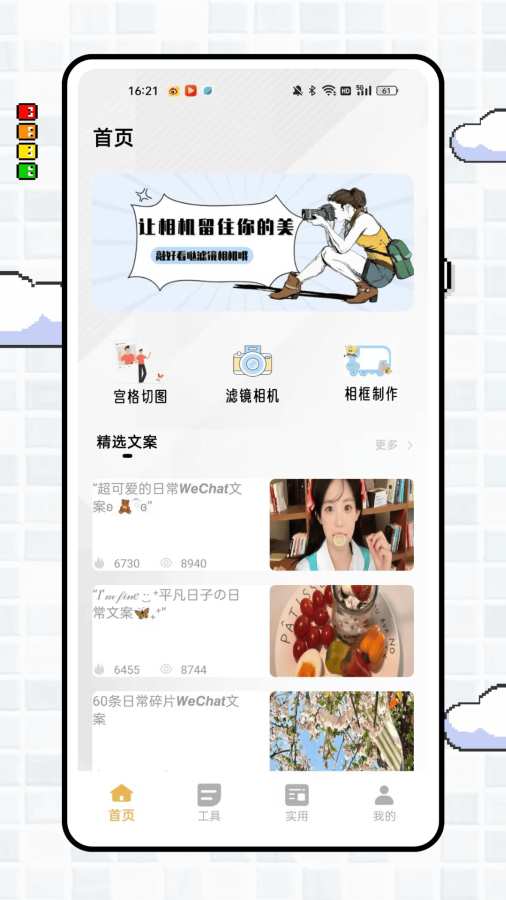 “ccdcam” 是聚焦影像美化与创意处理的实用 App 。首页以 “让相机留住你的美” 为引,“宫格切图”“滤镜相机”“相框制作” 提供基础美化玩法,精选文案适配日常分享,为照片增添氛围感。工具页涵盖 “水印去除”“美颜美妆” 等实用功能,搭配修图教程,从基础操作到进阶技巧,助力提升修图水平。实用页围绕拍摄美化,“贴纸滤镜” 丰富画面创意,“一键拼图” 有多款流行、热门模板,轻松拼接出独特风格;“证件照生成” 便捷高效,拍照技巧专区分享构图、发型等干货,覆盖自拍、古风、餐厅氛围等场景,全方位满足影像创作与美化需求 。
