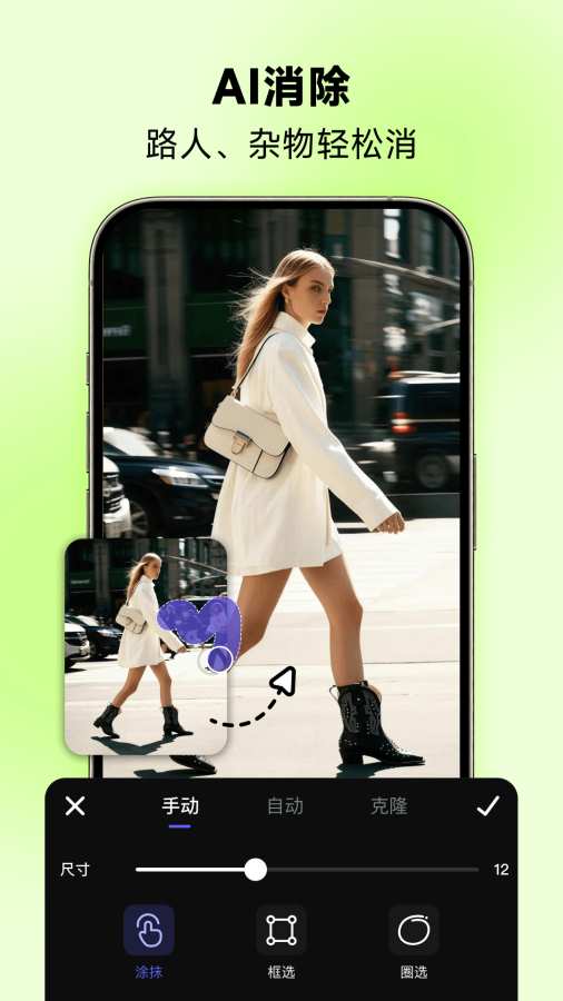 「AI消除」一键消除图片瑕疵,无痕还原。