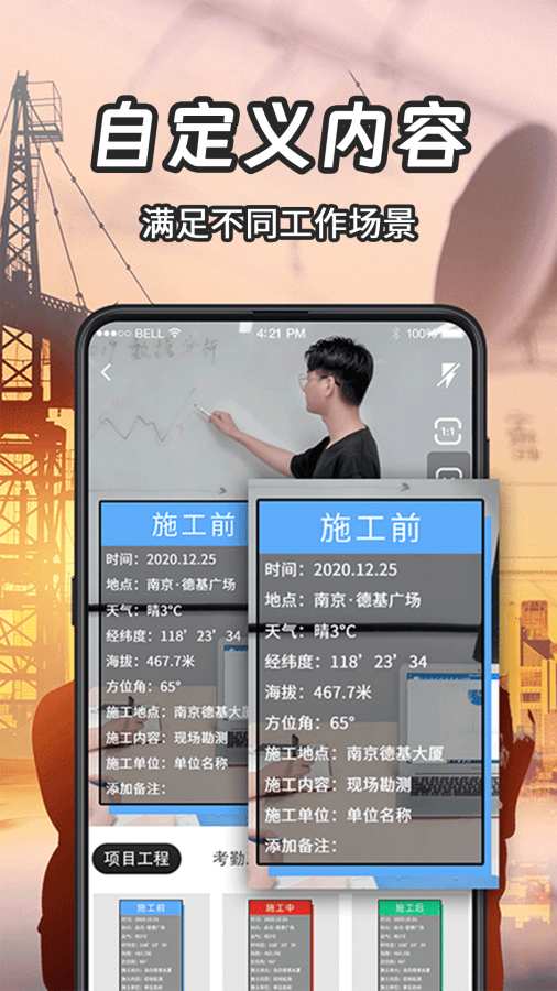 适合工程项目管理人员、项目施工团队、综合执法执勤、物业安全检查、市政施工美化、微商工作打卡等多场景的工作打卡场景需求,同时满足日常水印所需,旅游、宝宝成长记录、日常记录的一款打卡相机。