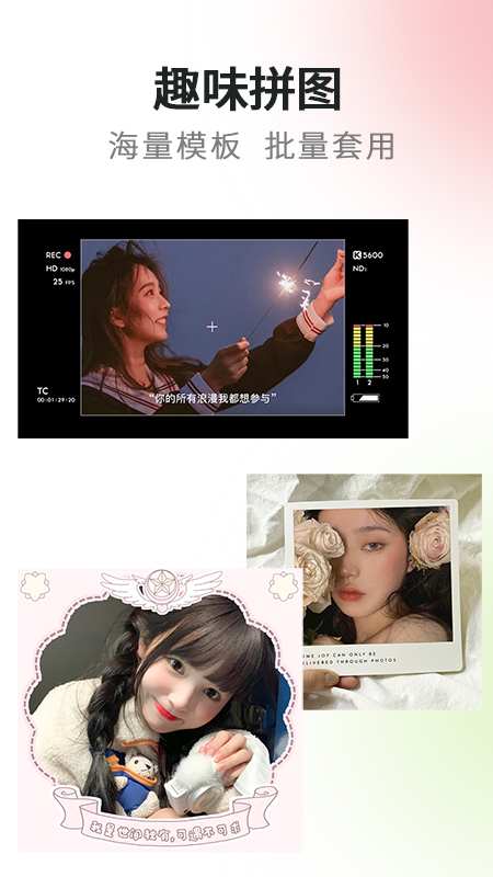 聚合多种拼图模板,将你搞怪瞬间、美貌时刻、俏皮表情全都拼在一张图片中,打造你的个性照片墙。