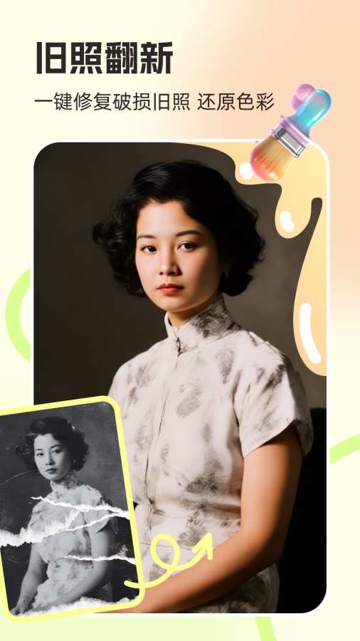 针对破损、褪色、露白的老照片,提供一件翻新上色的功能,可自动补全缺失细节、恢复原始色彩,让老照片焕然一新。
