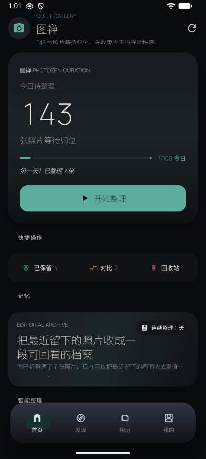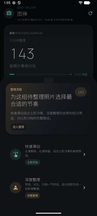 图禅是一款极简照片整理工具,用滑动手势快速筛选手机里的照片。 核心功能: - 滑动筛选:像刷短视频一样整理照片,右滑保留、左滑删除 - AI智能检测:自动识别模糊照片、重复照片、相似照片 - 出行回忆:基于GPS自动聚合旅行照片,生成出行时间线 - 每日任务:设定整理目标,培养日常整理习惯 - 成就系统:79项成就激励你持续整理 - 统计分析:日历热图、连续打卡、整理趋势一目了然 让整理照片变得简单有趣,告别手机里成千上万的废片。